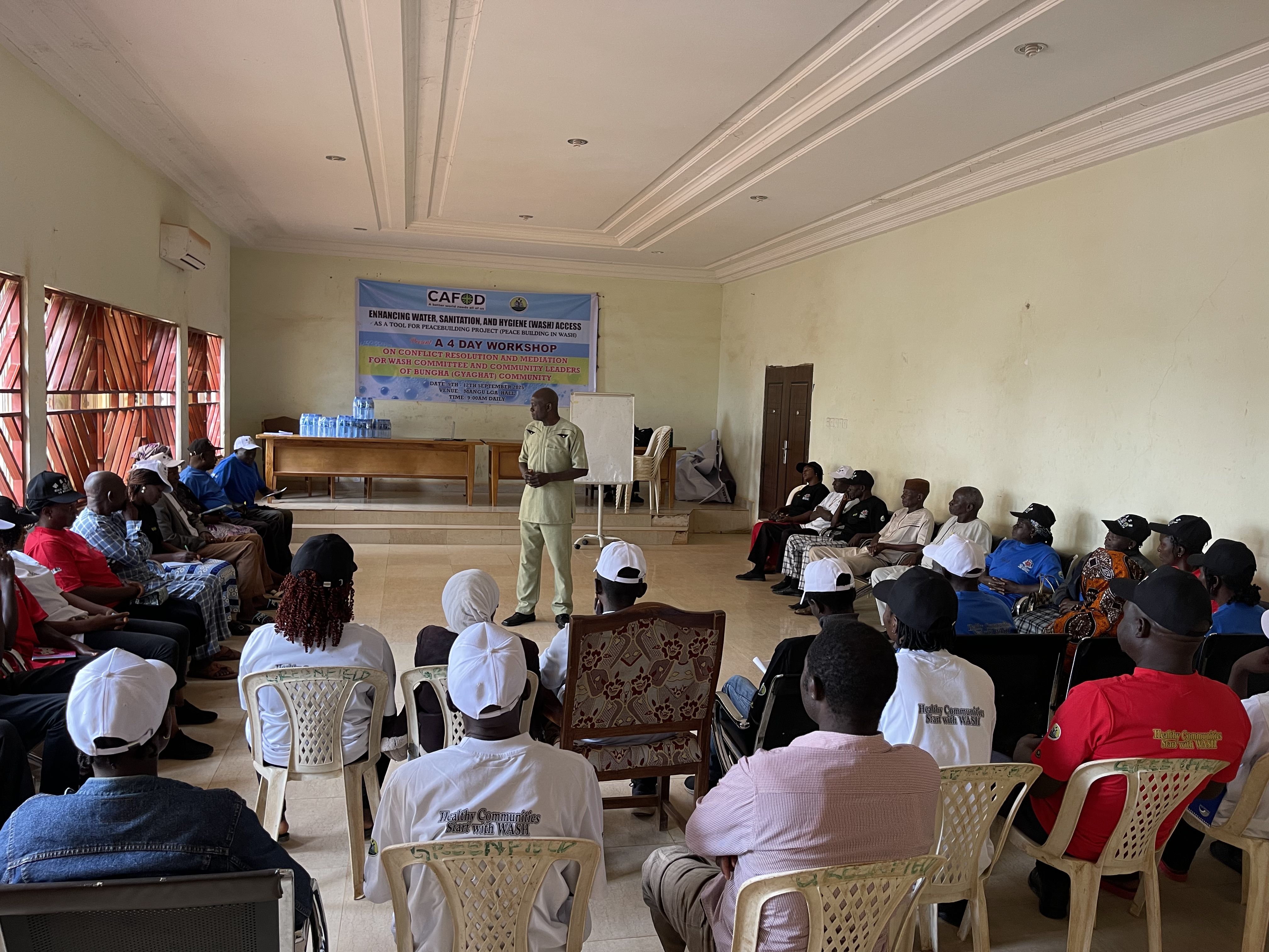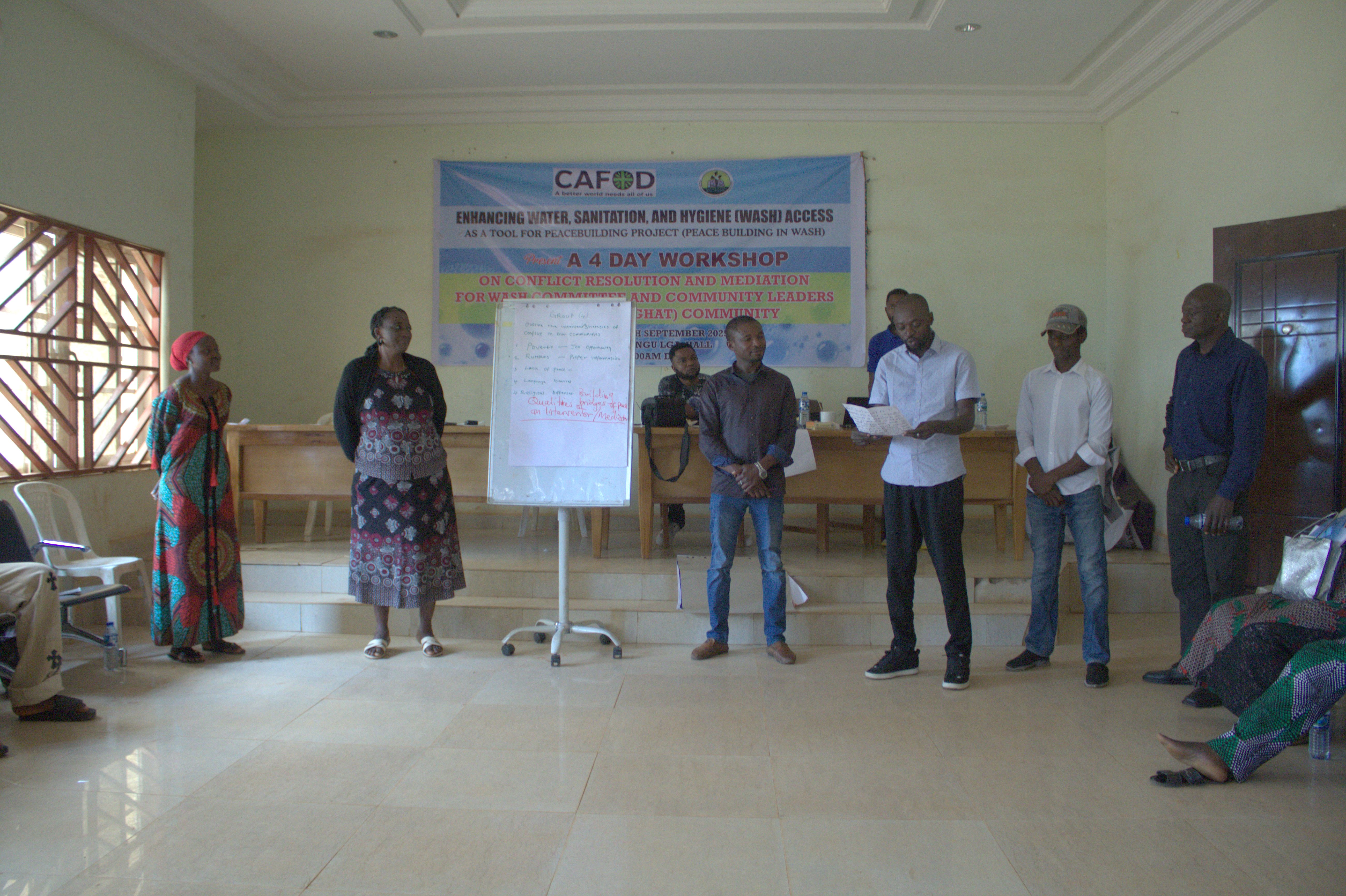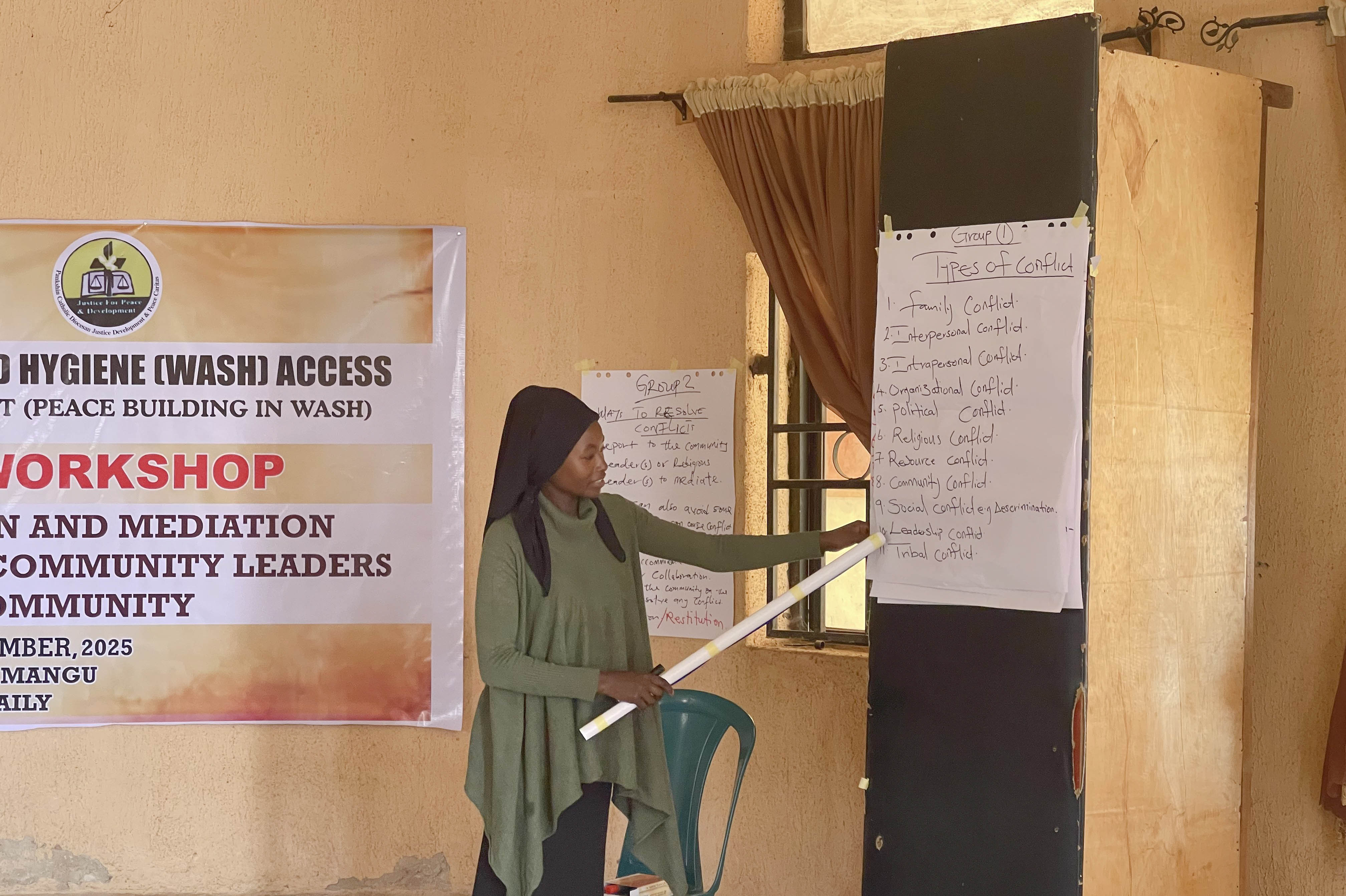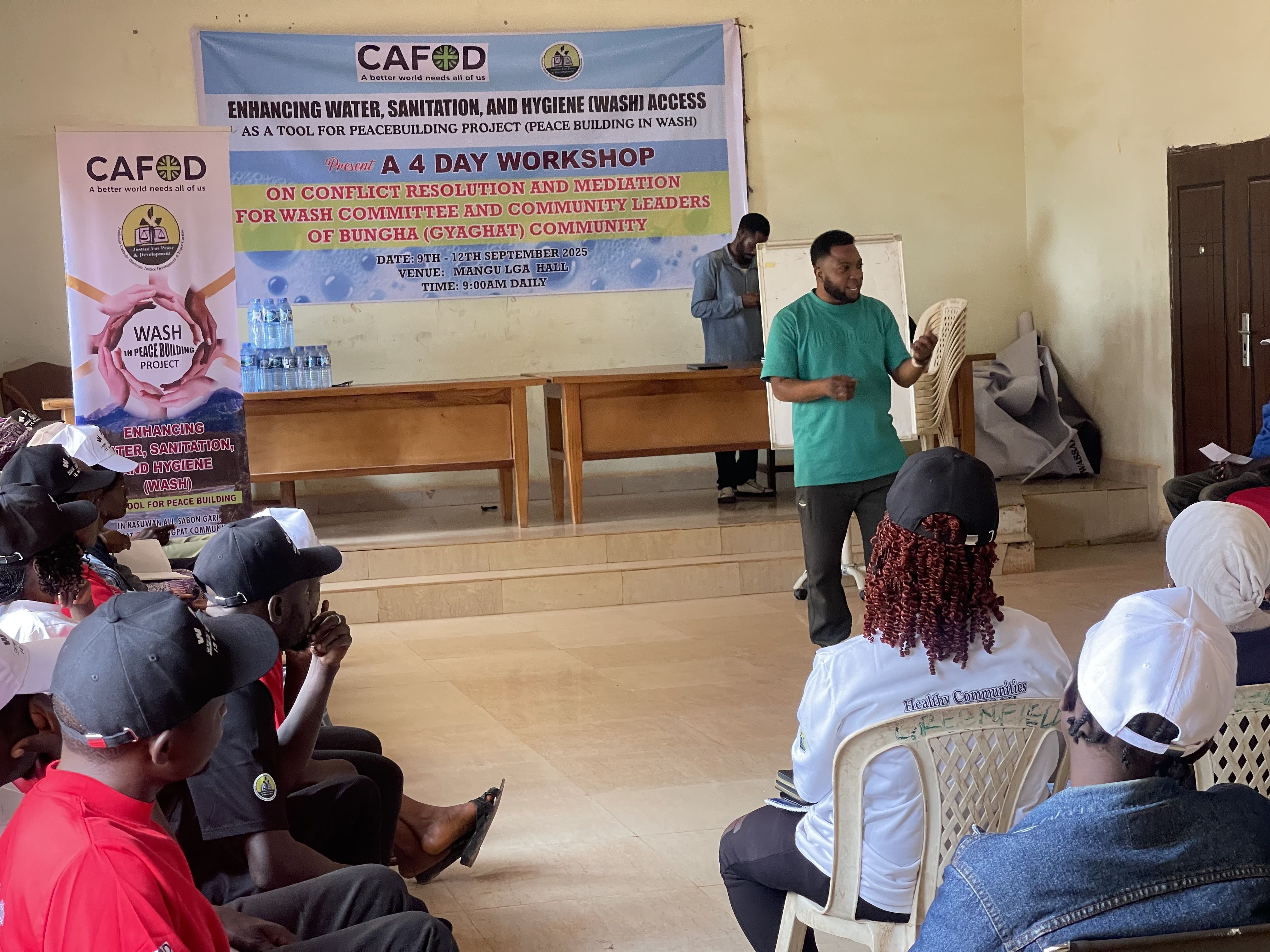 JDPC Pankshin, in partnership with CAFOD, is hosting a 4-day workshop on Conflict Resolution and Mediation for WASH Committees and community leaders of Bungha (Gyaghat) community under the project βEnhancing Water, Sanitation, and Hygiene (WASH) Access as a Tool for Peacebuilding.β The training aims to strengthen participantsβ capacity to resolve disputes, foster unity, and promote peaceful coexistence within their communities. Through interactive sessions, the facilitator engaged participants in discussions, group work, and presentations, using real-life scenarios and visual illustrations to deepen their understanding of conflict, its causes, and its effects.