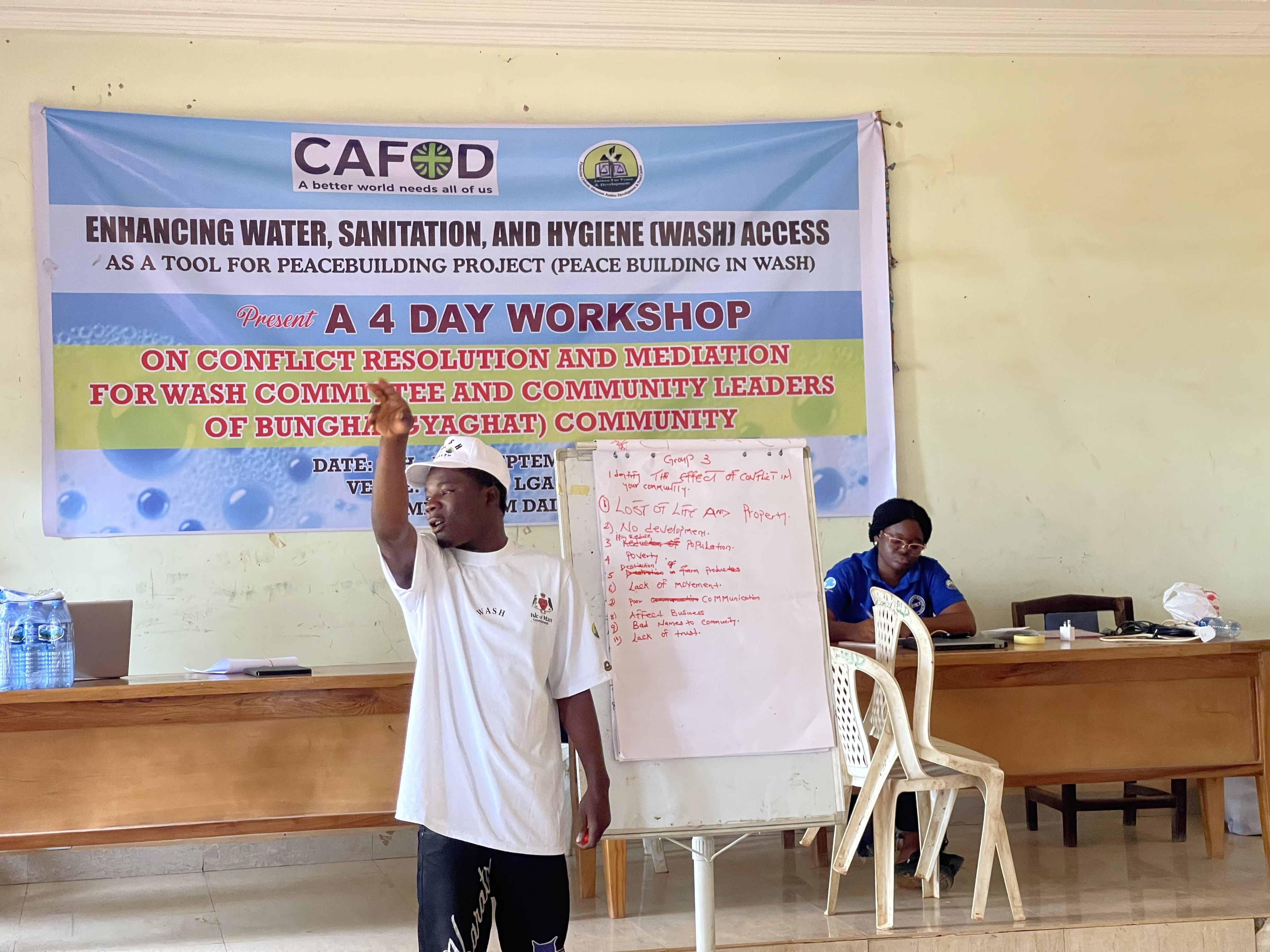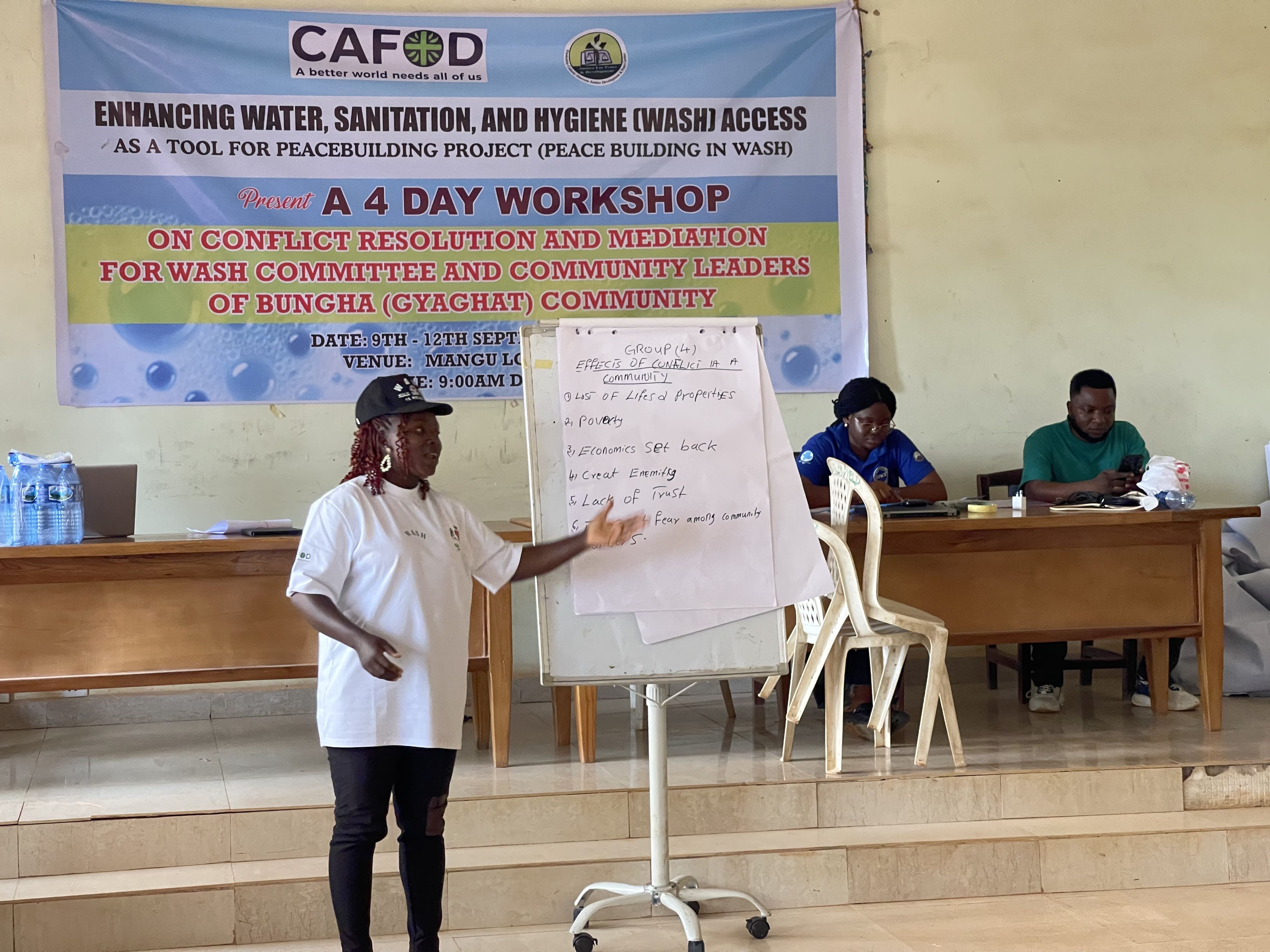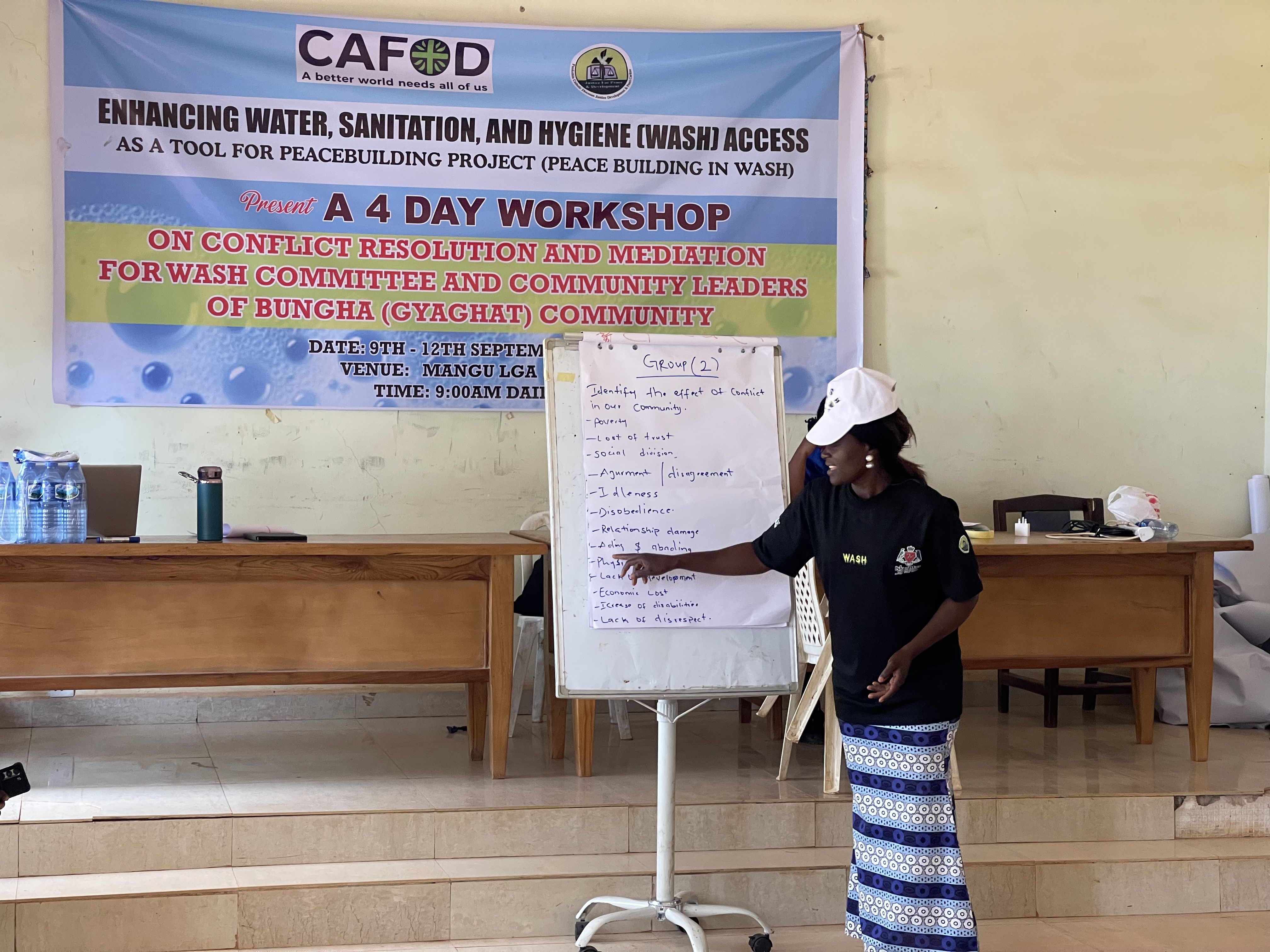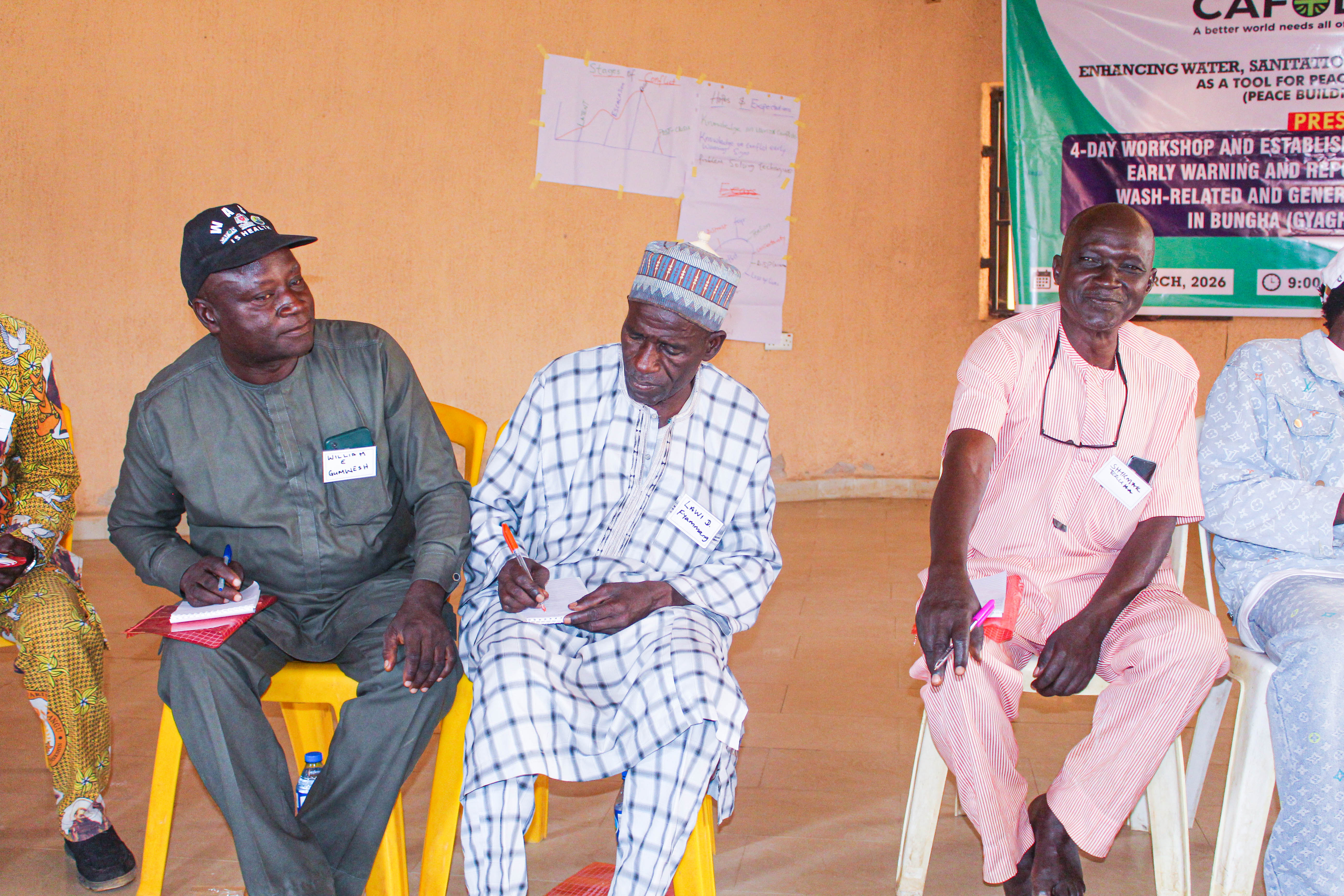 JDPC Pankshin, in partnership with CAFOD, is hosting a 4-day workshop on Conflict Resolution and Mediation for WASH Committees and community leaders of Bungha (Gyaghat) community under the project βEnhancing Water, Sanitation, and Hygiene (WASH) Access as a Tool for Peacebuilding.β The training aims to strengthen participantsβ capacity to resolve disputes, foster unity, and promote peaceful coexistence within their communities. Through interactive sessions, the facilitator engaged participants in discussions, group work, and presentations, using real-life scenarios and visual illustrations to deepen their understanding of conflict, its causes, and its effects.