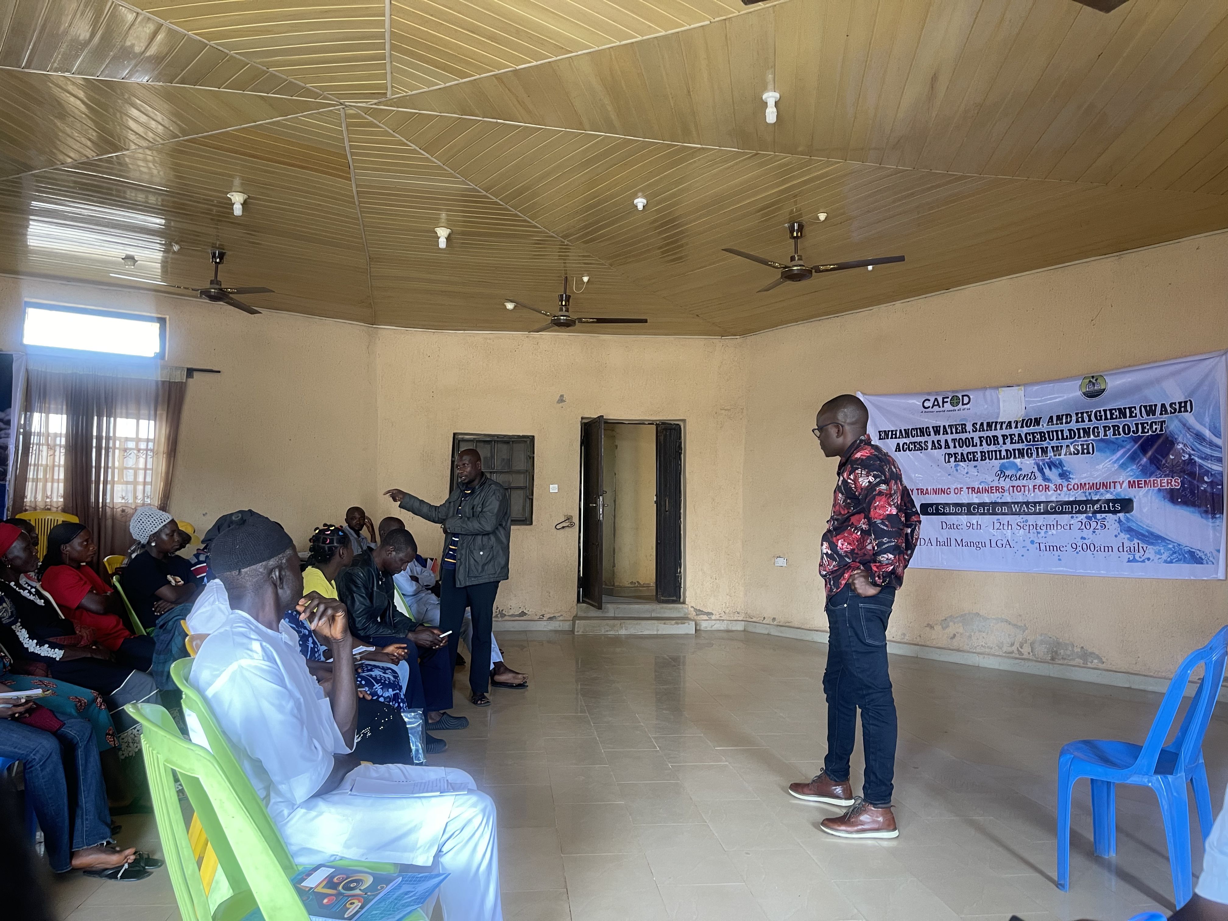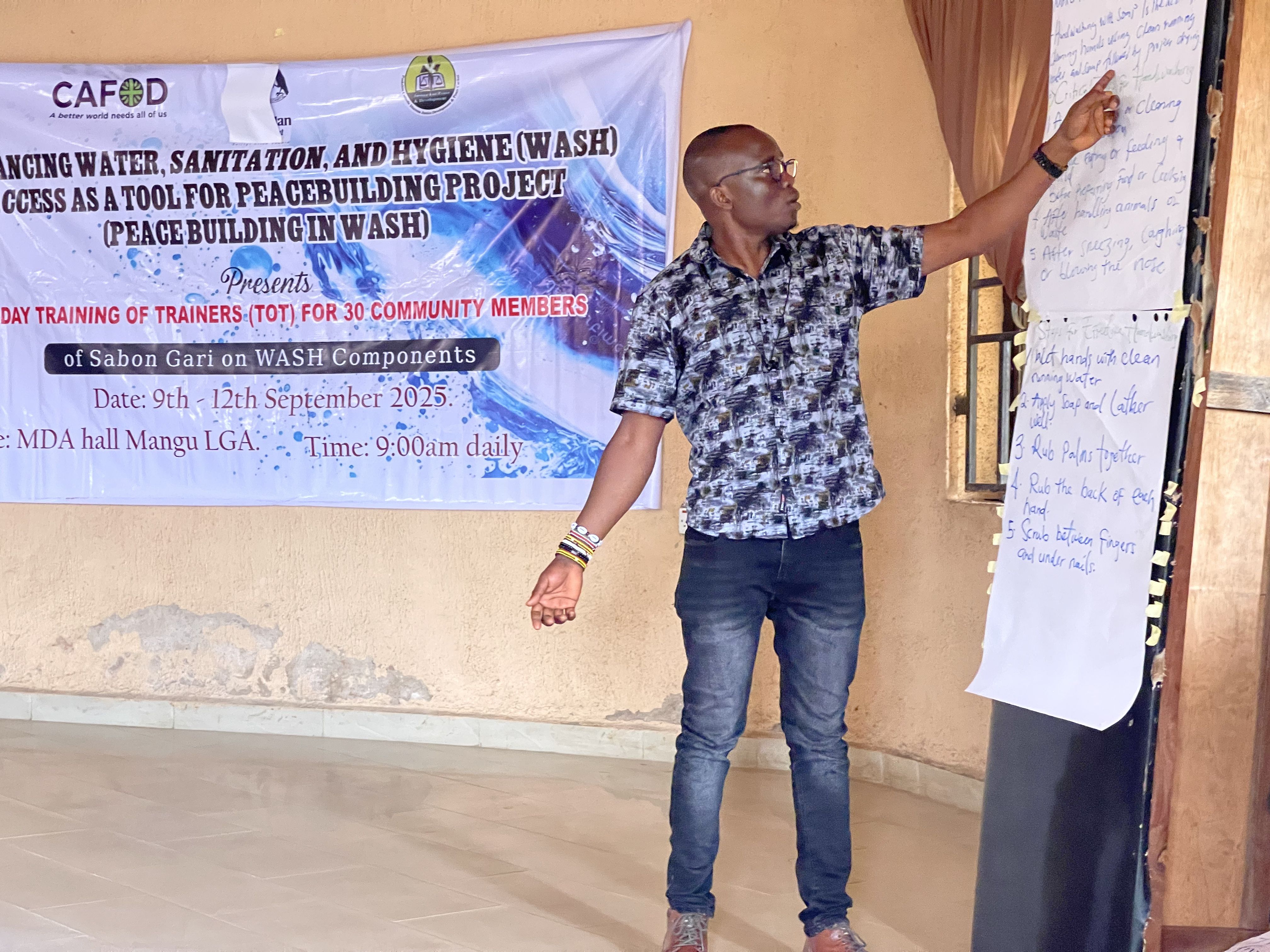 JDPC Pankshin, with support from CAFOD, is implementing the project βEnhancing WASH Access as a Tool for Peacebuilding.β As part of this initiative, a 4-day Training of Trainers (TOT) is being held for 30 community members of Sabon Gari to deepen their knowledge on Water, Sanitation, and Hygiene (WASH) components. The training focuses on equipping participants with practical skills to promote healthy living, foster community unity, and improve access to clean water and sanitation facilities within Sabon Gari and beyond.